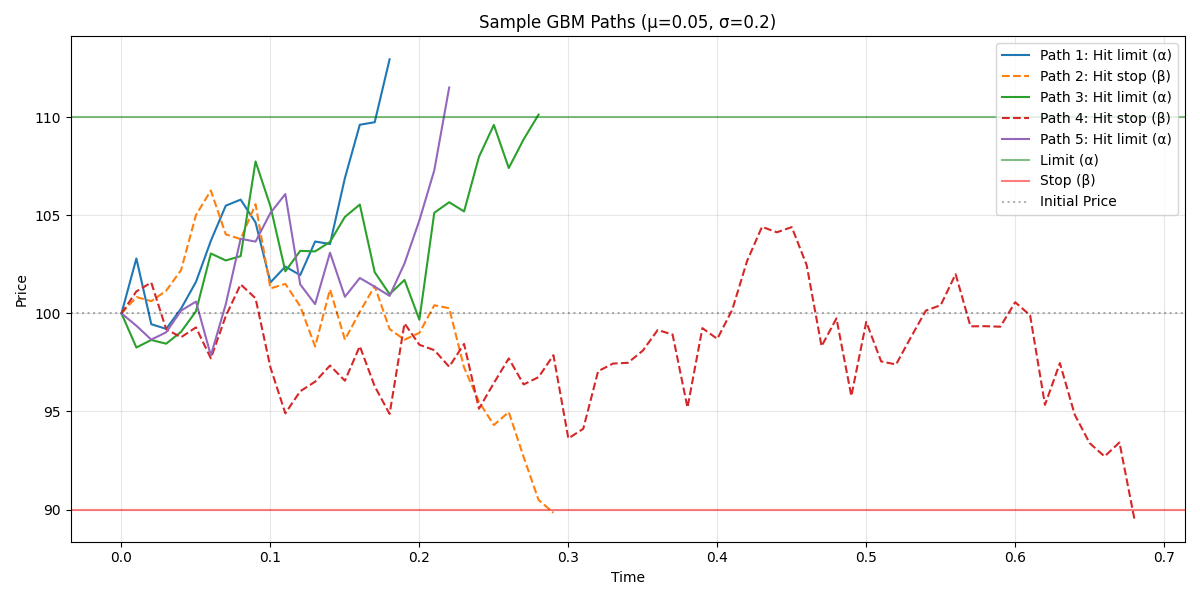 We can simulate financial asset price movements using Geometric Brownian Motion (GBM) with absorbing boundaries, calculating both theoretical probabilities and empirical results from Monte Carlo simulations. The methodology tests how drift parameters, volatility values, and boundary configurations affect the probability of hitting upper boundaries before lower ones, validating theoretical formulas with empirical tests across 10,000 simulation paths per parameter combination. The code is available at my GitHub repository.